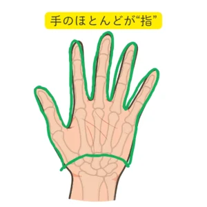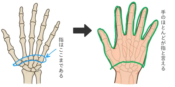 手のひら・手の甲と呼んでいる部分のほとんどが、指だと言っても良いことが分かりますね。