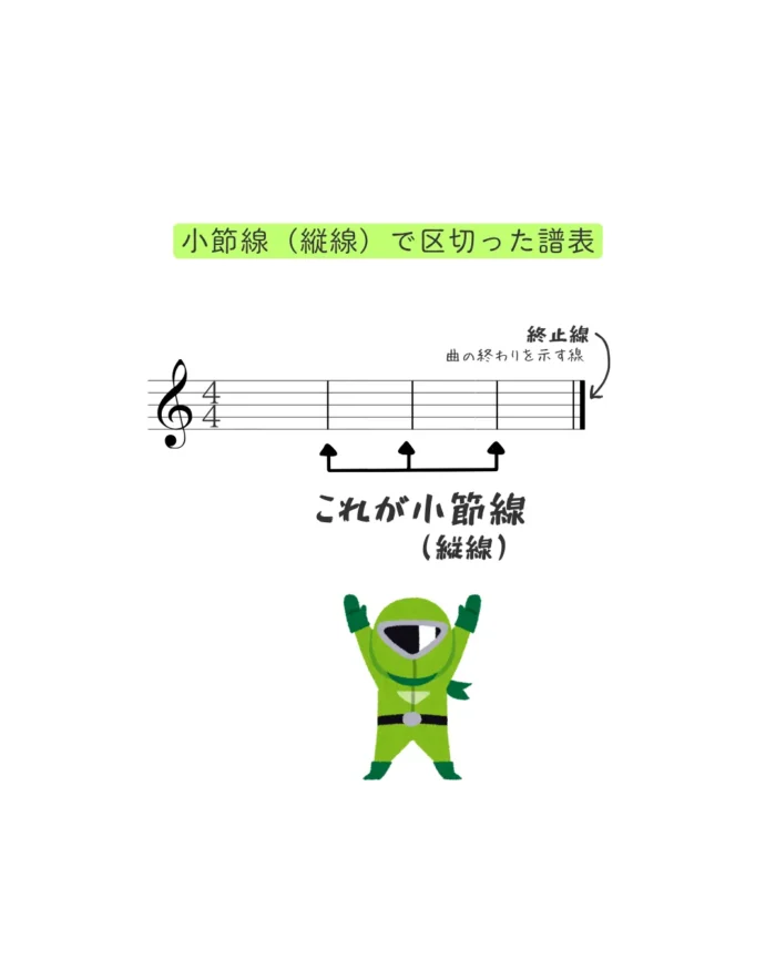 拍子ごとに区切った線を小節線と言います。縦線(じゅうせん)とも言います。