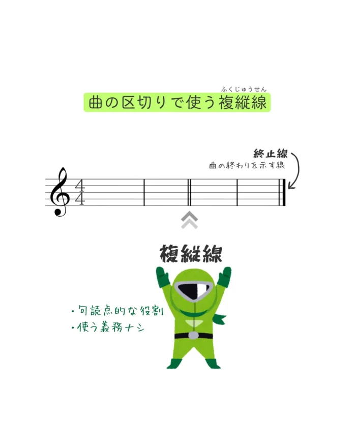長い曲では、複縦線があると「ここで次の場面なんだな」と分かるので、曲を理解するうえでとても役に立ちます。