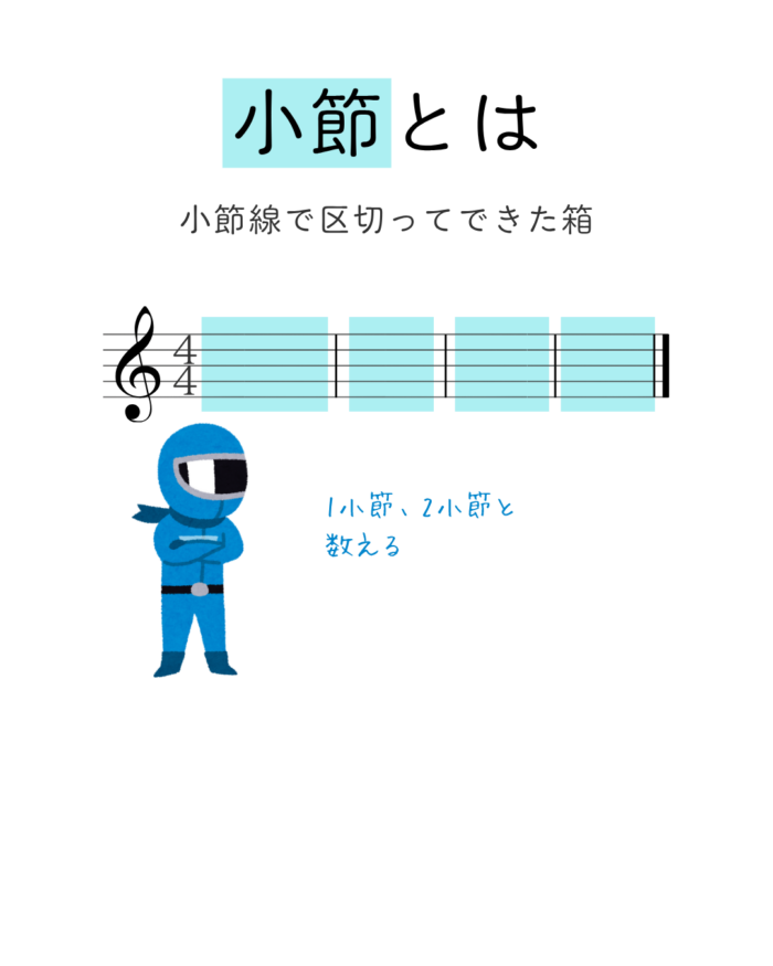 小節線で区切ってできた「箱」の部分。左から「1小節、2小節」と数えます。