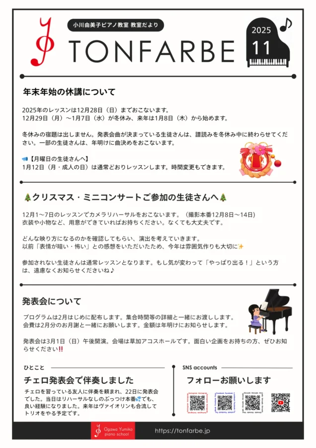 今、当教室ではクリスマス・ミニコンサートの準備が進んでいます。
