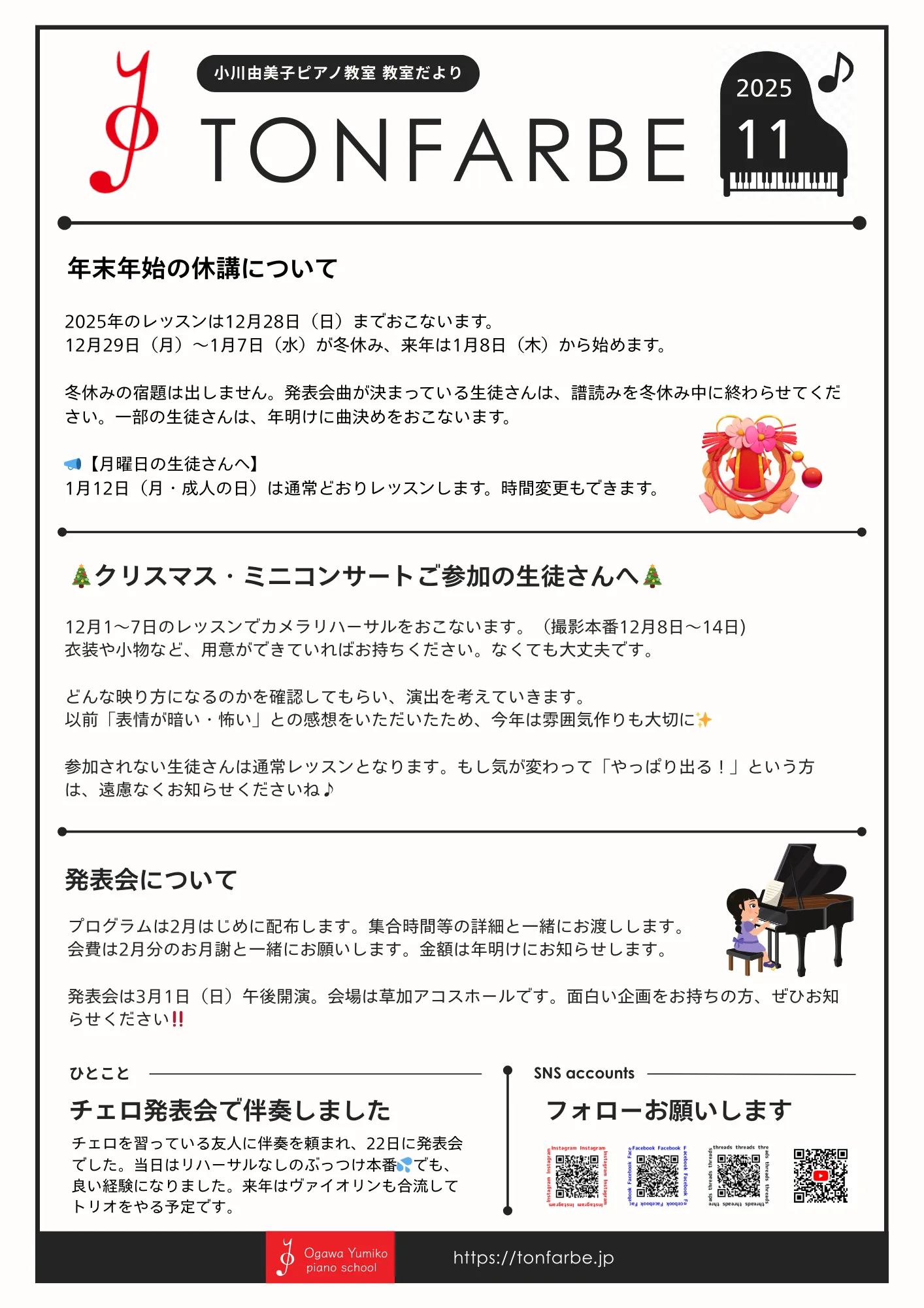 先週のレッスンで配布した最新の教室だよりです。体験レッスンにお越しの方にもお渡しします。